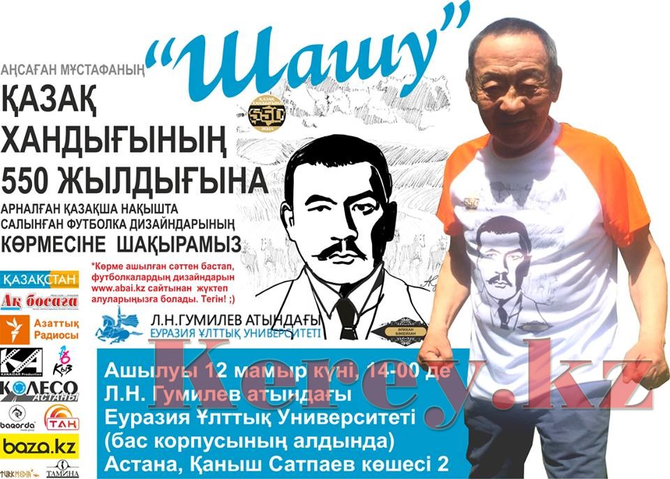 Асыл достар! Сендерді 12-сі күні, сағат 14-00 де Еуразия Ұлттық Универінің алдында (#Астана, Қаныш Сатпаев көшесі 2) “Шашу” атты көрмеме шақырам. Далада! Көрме #Қазақ Хандығының 550 жылдығына арналған. 550 жылға 55 түрлі футболкалардың дизайнын жасағам, сол сурет түрінде қойылады, және бұйырса 55 студент 55 түрлі футболка киіп қазақша күшті музыкаға би билейді! Сол Ұлы тойға шашуым деп қабыл аларсыңдар! “Сөйле, сурет” біте салсысымен күзде кірісіп кеткем! Мақсат жастардың рухын көтеру, жазда қазақша нақышта футболкалар көп болсын деген. #Футболка сатылмайды.#Көрме ашылған соң дизайнын abai.kz сайтынан таңдап, жүктеп алып кез-келген фотосалоннан шығарып алуларыңа болады. Футболканың неше түрі бар максималисттерге оюы көп, минималистерге жеңіл дизайнды, қаласаңдар қазақтың тарихындағы тұлғалардың портреттері, батырлар, салт-дәстүр деп кете береді. Келесіңдер ме?