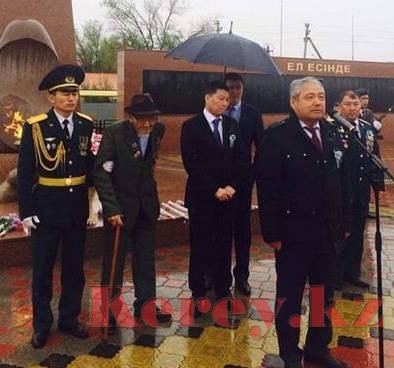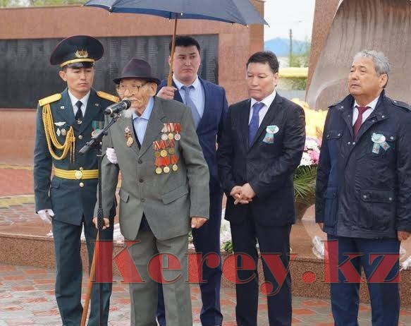 Ардагер ақсақал тамшылаған жауын астында қалып, сарбаздың сүйемелдеуімен қалбалақтап әрең тұр.