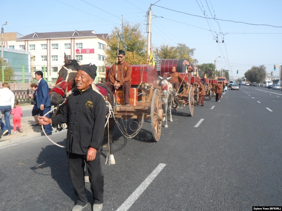 Жамбыл облысының орталығы Тараз қаласында Қазақ хандығының 550 жылдығы мерекесіне арналған шара кезінде Қытайдың Шэньси провинциясынан келген 40 түйелі керуен жүріп өтті. Олардан кейін атқа арба жеккен адамдар да өтті. Бұл керуен Ұлы Жібек жолын жаңғырту мақсатында ұйымдастырылған. Тараз, 8 қазан 2015 жыл.