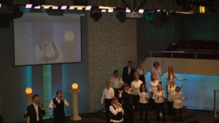 “Жаңа өмір” шіркеуінде шіркеу әін айтып тұрған адамдар. Алматы, 28 қаңтар 2013 жыл.
