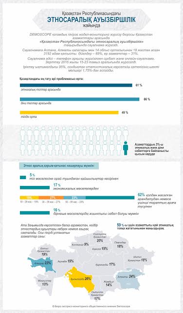 | DEMOSCOPE қоғамдық пікірге жедел-мониторинг жүргізу бюросы Қазақстан азаматтары арасында «Қазақстан Республикасындағы этносаралық ауызбіршілік» тақырыбында сауалнама жүргізді. Сауалнамаға Астана, Алматы қалалары мен 14 облыс орталығынан 18 жастан асқан 3192 адам қатысты. Әйелдер – 69%, ер азаматтар – 31%. Іріктеу ықтималдығы 95%, сондықтан статистикалық көрсеткіш қателігінің шекті мөлшері 1,75%-дан аспайды.